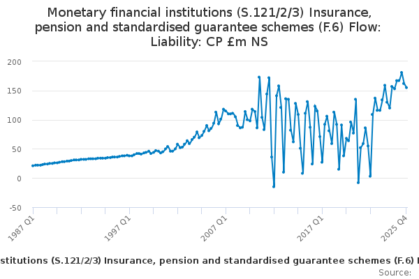 Download this time seriesMonetary financial institutions (S.121/2/3) Insurance, pension and standardised guarantee schemes (F.6) Flow: Liability: CP £m NS