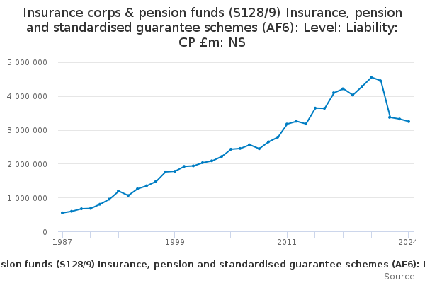 Download this time seriesInsurance corps & pension funds (S128/9) Insurance, pension and standardised guarantee schemes (AF6): Level: Liability: CP £m: NS