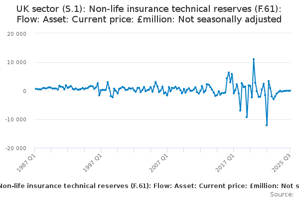 Download this time seriesUK sector (S.1): Non-life insurance technical reserves (F.61): Flow: Asset: Current price: £million: Not seasonally adjusted
