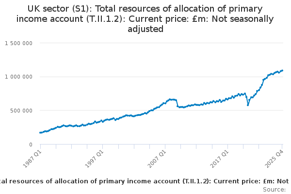 Download this time seriesUK sector (S1): Total resources of allocation of primary income account (T.II.1.2): Current price: £m: Not seasonally adjusted