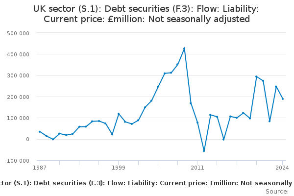 Download this time seriesUK sector (S.1): Debt securities (F.3): Flow: Liability: Current price: £million: Not seasonally adjusted