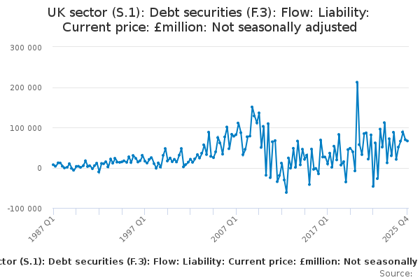 Download this time seriesUK sector (S.1): Debt securities (F.3): Flow: Liability: Current price: £million: Not seasonally adjusted