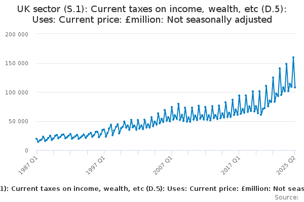 Download this time seriesUK sector (S.1): Current taxes on income, wealth, etc (D.5): Uses: Current price: £million: Not seasonally adjusted