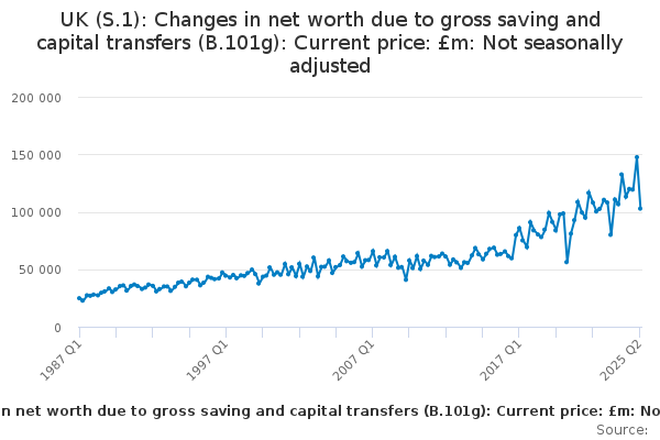 Download this time seriesUK (S.1): Changes in net worth due to gross saving and capital transfers (B.101g): Current price: £m: Not seasonally adjusted