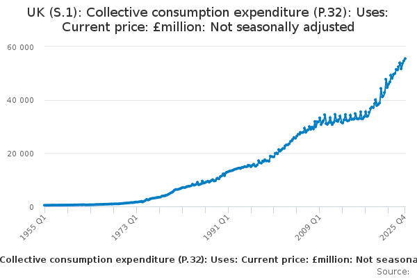 Download this time seriesUK (S.1): Collective consumption expenditure (P.32): Uses: Current price: £million: Not seasonally adjusted