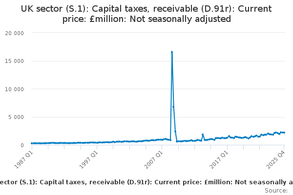 Download this time seriesUK sector (S.1): Capital taxes, receivable (D.91r): Current price: £million: Not seasonally adjusted