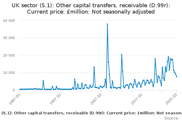 Download this time seriesUK sector (S.1): Other capital transfers, receivable (D.99r): Current price: £million: Not seasonally adjusted