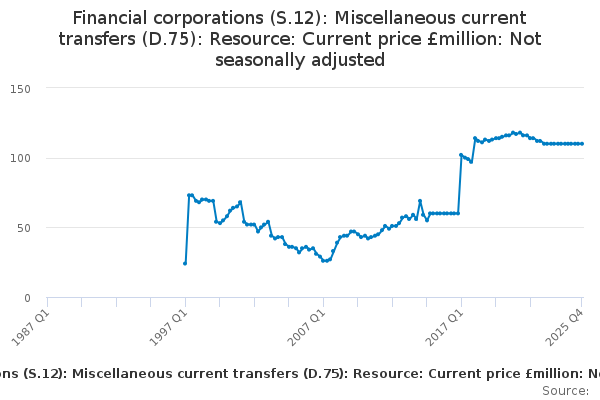 Download this time seriesFinancial corporations (S.12): Miscellaneous current transfers (D.75): Resource: Current price £million: Not seasonally adjusted