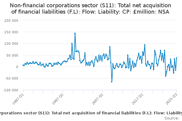 Download this time seriesNon-financial corporations sector (S11): Total net acquisition of financial liabilities (F.L): Flow: Liability: CP: £million: NSA