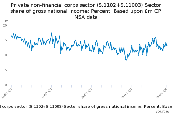 Download this time seriesPrivate non-financial corps sector (S.1102+S.11003) Sector share of gross national income: Percent: Based upon £m CP NSA data