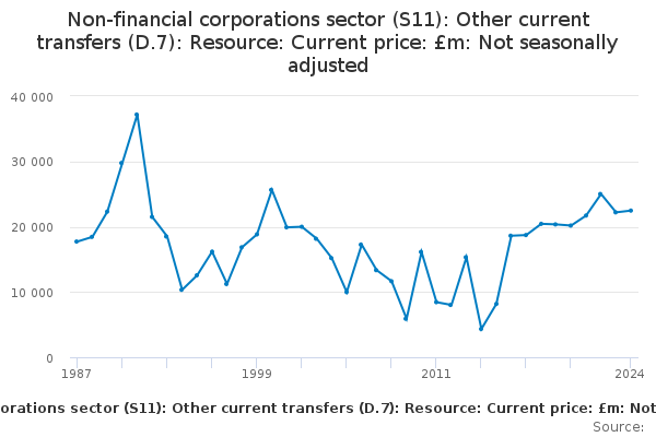 Download this time seriesNon-financial corporations sector (S11): Other current transfers (D.7): Resource: Current price: £m: Not seasonally adjusted