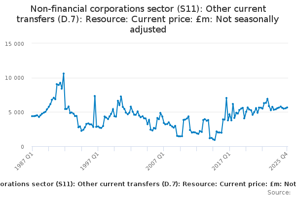 Download this time seriesNon-financial corporations sector (S11): Other current transfers (D.7): Resource: Current price: £m: Not seasonally adjusted