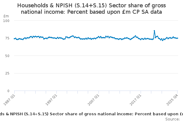 Download this time seriesHouseholds & NPISH (S.14+S.15) Sector share of gross national income: Percent based upon £m CP SA data