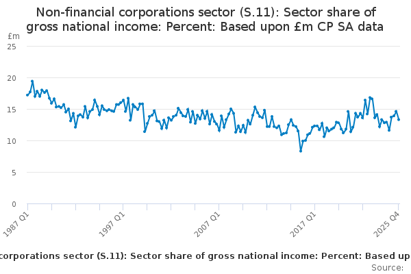 Download this time seriesNon-financial corporations sector (S.11): Sector share of gross national income: Percent: Based upon £m CP SA data