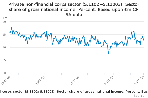 Download this time seriesPrivate non-financial corps sector (S.1102+S.11003): Sector share of gross national income: Percent: Based upon £m CP SA data