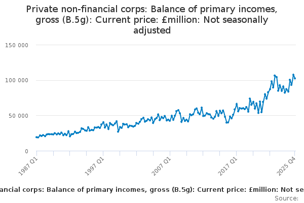 Download this time seriesPrivate non-financial corps: Balance of primary incomes, gross (B.5g): Current price: £million: Not seasonally adjusted