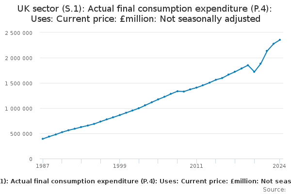 Download this time seriesUK sector (S.1): Actual final consumption expenditure (P.4): Uses: Current price: £million: Not seasonally adjusted