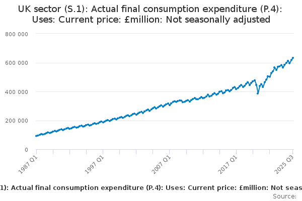Download this time seriesUK sector (S.1): Actual final consumption expenditure (P.4): Uses: Current price: £million: Not seasonally adjusted