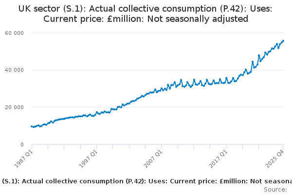 Download this time seriesUK sector (S.1): Actual collective consumption (P.42): Uses: Current price: £million: Not seasonally adjusted