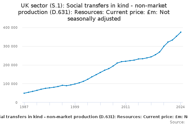 Download this time seriesUK sector (S.1): Social transfers in kind - non-market production (D.631): Resources: Current price: £m: Not seasonally adjusted