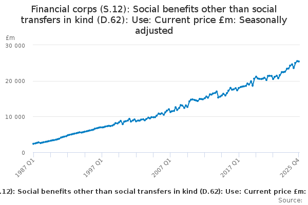 Download this time seriesFinancial corps (S.12): Social benefits other than social transfers in kind (D.62): Use: Current price £m: Seasonally adjusted