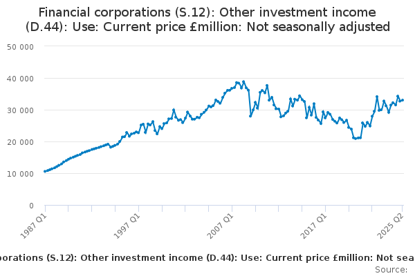 Download this time seriesFinancial corporations (S.12): Other investment income (D.44): Use: Current price £million: Not seasonally adjusted