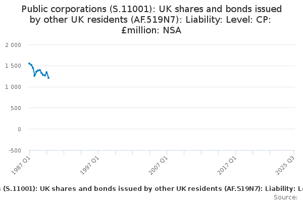 Download this time seriesPublic corporations (S.11001): UK shares and bonds issued by other UK residents (AF.519N7): Liability: Level: CP: £million: NSA