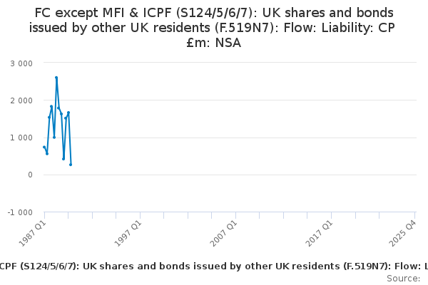 Download this time seriesFC except MFI & ICPF (S124/5/6/7): UK shares and bonds issued by other UK residents (F.519N7): Flow: Liability: CP £m: NSA