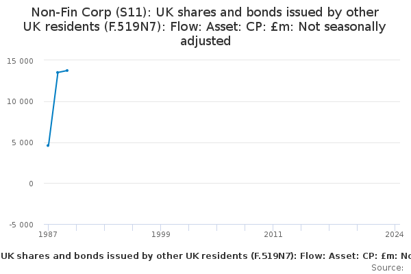 Download this time seriesNon-Fin Corp (S11): UK shares and bonds issued by other UK residents (F.519N7): Flow: Asset: CP: £m: Not seasonally adjusted