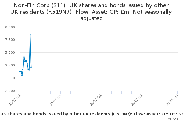 Download this time seriesNon-Fin Corp (S11): UK shares and bonds issued by other UK residents (F.519N7): Flow: Asset: CP: £m: Not seasonally adjusted