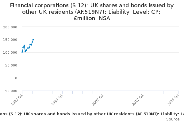 Download this time seriesFinancial corporations (S.12): UK shares and bonds issued by other UK residents (AF.519N7): Liability: Level: CP: £million: NSA