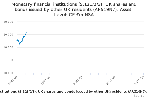 Download this time seriesMonetary financial institutions (S.121/2/3): UK shares and bonds issued by other UK residents (AF.519N7): Asset: Level: CP £m NSA