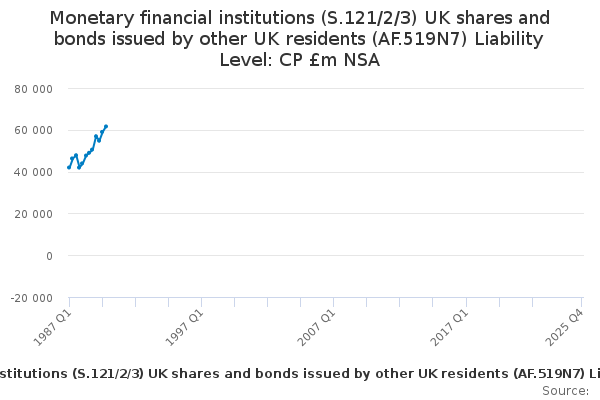 Download this time seriesMonetary financial institutions (S.121/2/3) UK shares and bonds issued by other UK residents (AF.519N7) Liability Level: CP £m NSA
