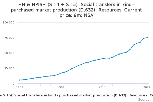 Download this time seriesHH & NPISH (S.14 + S.15): Social transfers in kind - purchased market production (D.632): Resources: Current price: £m: NSA