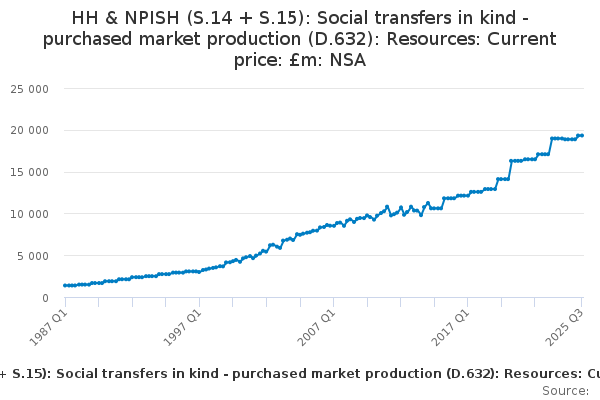 Download this time seriesHH & NPISH (S.14 + S.15): Social transfers in kind - purchased market production (D.632): Resources: Current price: £m: NSA