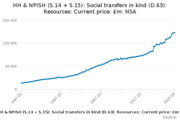 Download this time seriesHH & NPISH (S.14 + S.15): Social transfers in kind (D.63): Resources: Current price: £m: NSA