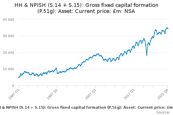 Download this time seriesHH & NPISH (S.14 + S.15): Gross fixed capital formation (P.51g): Asset: Current price: £m: NSA