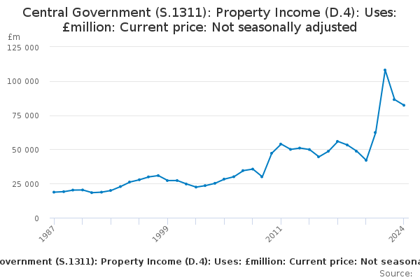Download this time seriesCentral Government (S.1311): Property Income (D.4): Uses: £million: Current price: Not seasonally adjusted