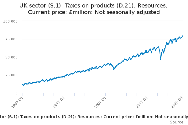 Download this time seriesUK sector (S.1): Taxes on products (D.21): Resources: Current price: £million: Not seasonally adjusted