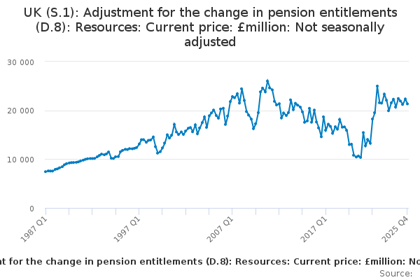 Download this time seriesUK (S.1): Adjustment for the change in pension entitlements (D.8): Resources: Current price: £million: Not seasonally adjusted