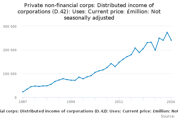 Download this time seriesPrivate non-financial corps: Distributed income of corporations (D.42): Uses: Current price: £million: Not seasonally adjusted