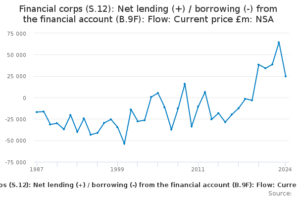 Download this time seriesFinancial corps (S.12): Net lending (+) / borrowing (-) from the financial account (B.9F): Flow: Current price £m: NSA