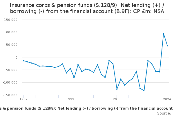 Download this time seriesInsurance corps & pension funds (S.128/9): Net lending (+) / borrowing (-) from the financial account (B.9F): CP £m: NSA