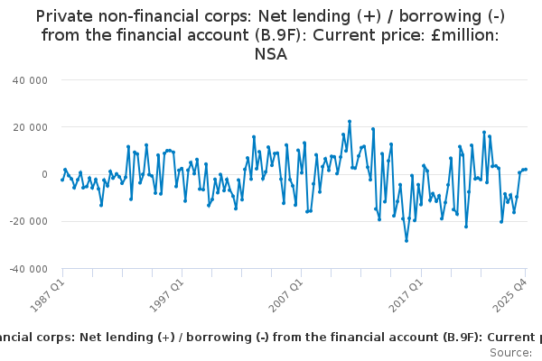 Download this time seriesPrivate non-financial corps: Net lending (+) / borrowing (-) from the financial account (B.9F): Current price: £million: NSA