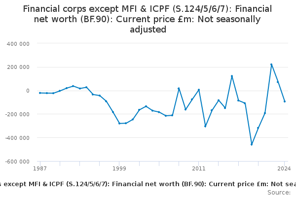 Download this time seriesFinancial corps except MFI & ICPF (S.124/5/6/7): Financial net worth (BF.90): Current price £m: Not seasonally adjusted