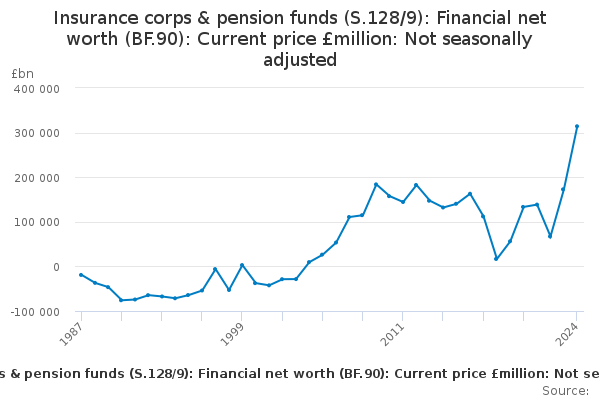 Download this time seriesInsurance corps & pension funds (S.128/9): Financial net worth (BF.90): Current price £million: Not seasonally adjusted