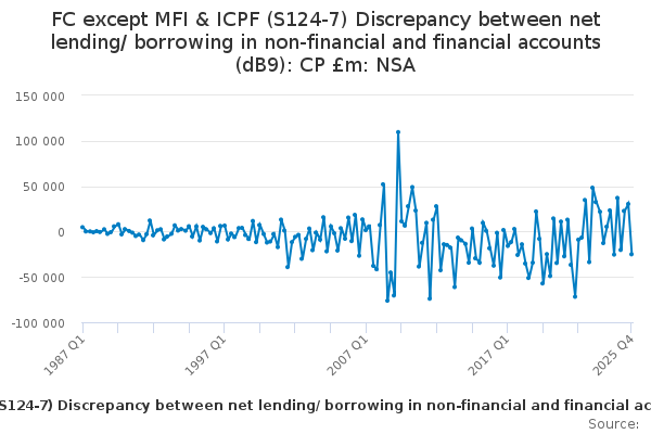 Download this time seriesFC except MFI & ICPF (S124-7) Discrepancy between net lending/ borrowing in non-financial and financial accounts (dB9): CP £m: NSA
