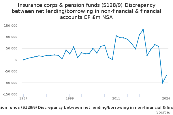 Download this time seriesInsurance corps & pension funds (S128/9) Discrepancy between net lending/borrowing in non-financial & financial accounts CP £m NSA