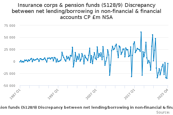 Download this time seriesInsurance corps & pension funds (S128/9) Discrepancy between net lending/borrowing in non-financial & financial accounts CP £m NSA