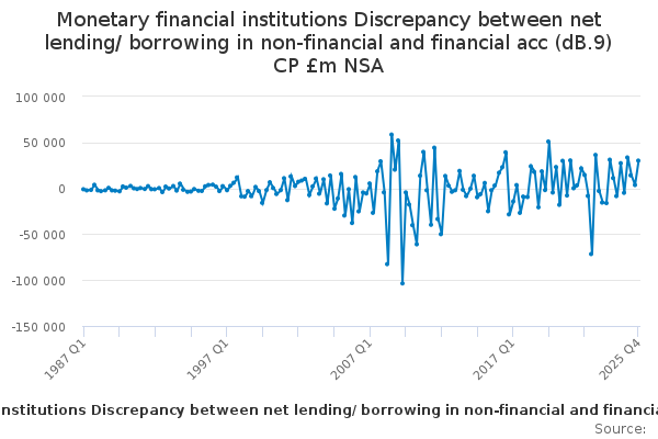 Download this time seriesMonetary financial institutions Discrepancy between net lending/ borrowing in non-financial and financial acc (dB.9) CP £m NSA
